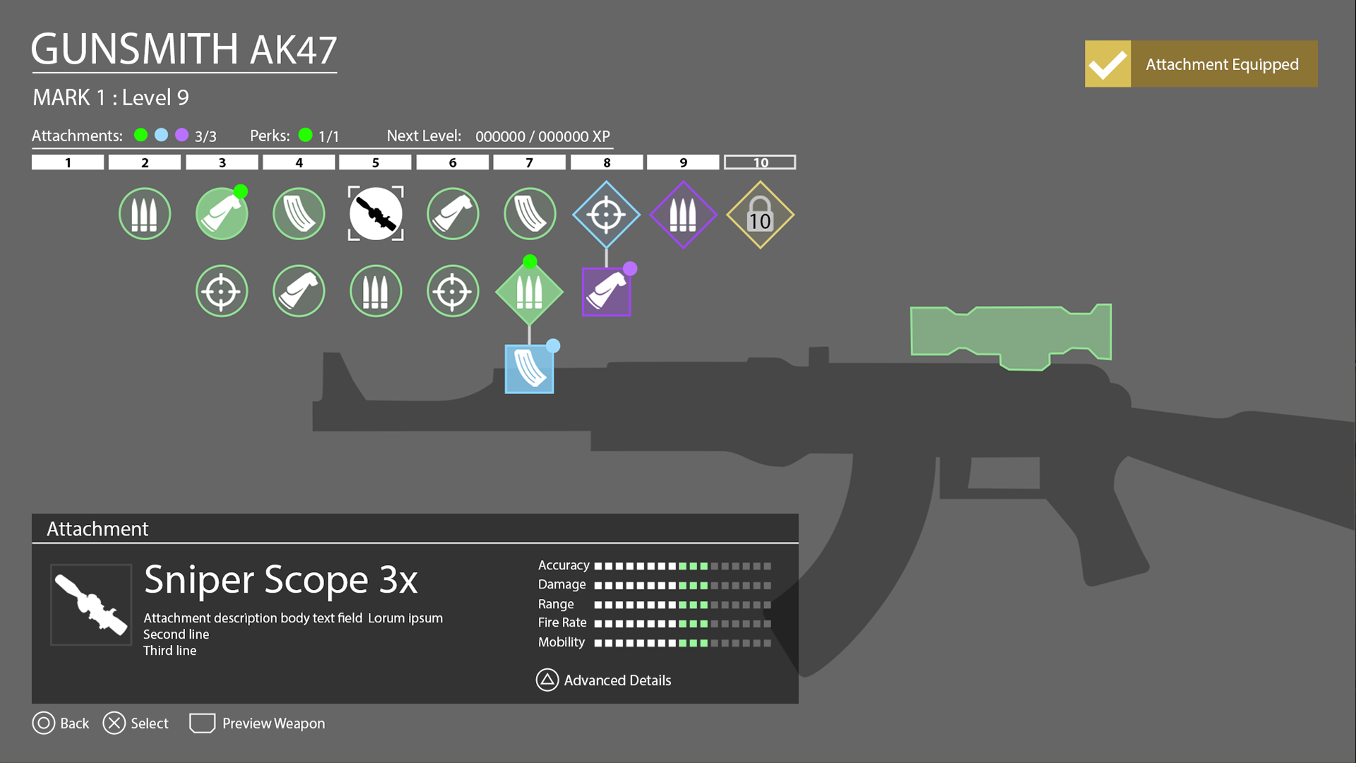 After being briefed by the game designer on the feature, I got to work, iterating on the UX and UI many times until eventually arriving at a design that felt great. What we created focused primarily on the weapon, swapping the attachments feeling like tangible interaction.